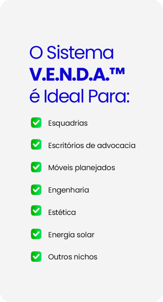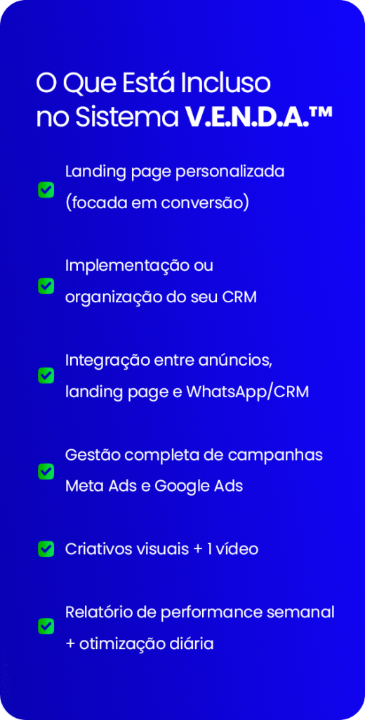 Com o Sistema V.E.N.D.A.™, você atrai clientes todos os dias com campanhas otimizadas, automação e estratégias comprovadas
